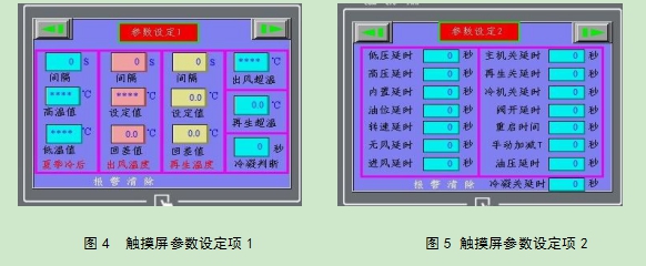 參數設定包括:觸摸屏參數設定及電氣元件參數設定。觸摸屏參數設定項如圖 4、圖 5 所示。電氣元件參數設定項主要包括壓縮機排氣超溫報警值,噴液溫度值,主加熱超溫值、再生加熱超溫值,壓縮機吸氣低壓報警值,壓縮機排氣高壓報警值,主風道無風報警值, 主風道超壓報警,冷凝風機過載,主風機過載,壓縮機過載等