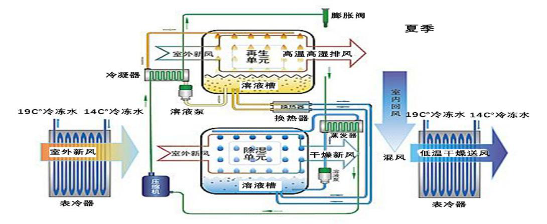 溶液除濕空調(diào)系統(tǒng)是基于以除濕溶液為吸濕劑調(diào)節(jié)空氣濕度,以水為制冷劑調(diào)節(jié)空氣溫度的主動除濕空氣處理技術(shù)而開發(fā)的可以提供全新風(fēng)運行工況的新型空調(diào)產(chǎn)品;其核心是利用除濕劑物理特性,通過創(chuàng)新的溶液除濕與再生的方法,實現(xiàn)在露點溫度之上高效除濕。系統(tǒng)溫濕度調(diào)節(jié)完全在常壓開式氣氛中進行。具有制造簡單,運轉(zhuǎn)可靠,節(jié)能高效等技術(shù)特點。