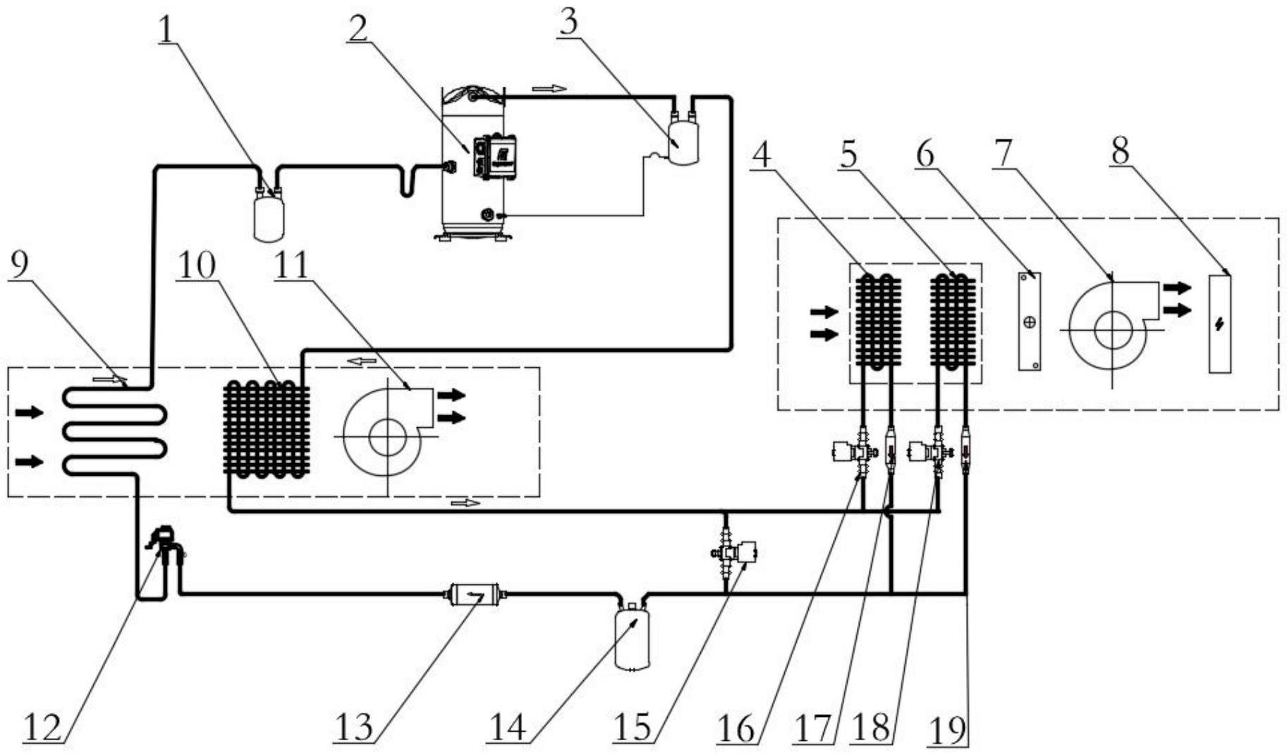 一種節能型高溫烘干除濕機,申請號或專利號:202410975186.6,本發明涉及除濕機技術領域,尤其涉及一種節能型高溫烘干除濕機。其技術方案包括:高溫烘干房和固定安裝于高溫烘干房一側的除濕房,還包括:設于除濕房內的第一風道和第二風道,制冷循環系統,所述制冷循環系統安裝于第一風道和第二風道內,冷凝器控制系統,所述冷凝器控制系統安裝于第一風道和第二風道內。本發明可以完全利用第一冷凝器和第二冷凝器以及第三冷凝器內的熱量,并且不需要經過排濕過程損失大量熱量同時也降低了效率,節能高效;通過控制第二冷凝器和第三冷凝器的啟閉狀態,能夠實現多級變化不僅可以適應寬范圍烘干溫度,而且在各溫度下均能穩定安全運行。