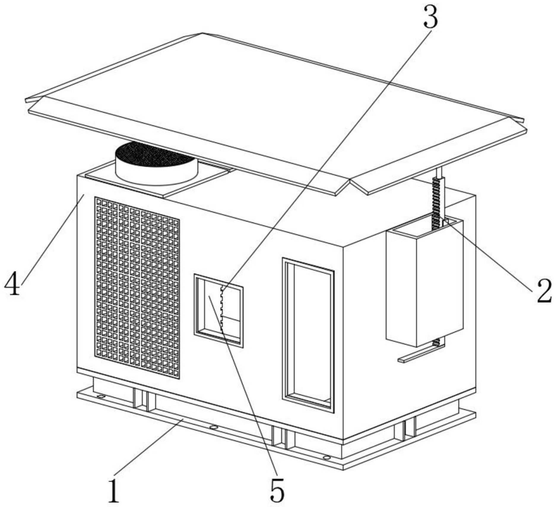 一體式的屋頂空調機,專利號:ZL 2024 2 0258431.7,涉及空調技術領域,而本實用新型包括槽鋼底座,槽鋼底座的頂端固定連接有空調機本體,空調機本體的內部設置有散熱片,空調機本體的上內壁設置有配合散熱片使用的清理組件,空調機本體的一端上部設置有防雨組件,防雨組件包括連接殼,連接殼的一端與空調機本體的一端上部固定連接,連接殼的一側內壁固定連接有第一支座,第一支座的頂端固定連接有第一電機,且第一電機的輸出端固定連接有第一錐齒輪,本實用新型通過設置防雨組件,起到便于使得空調機具有防水功能的作用,提高了空調機的實用性,通過設置清理組件,起到便于對空調機中的散熱片表面灰塵進行清理的作用,提高了空調機的使用效果。