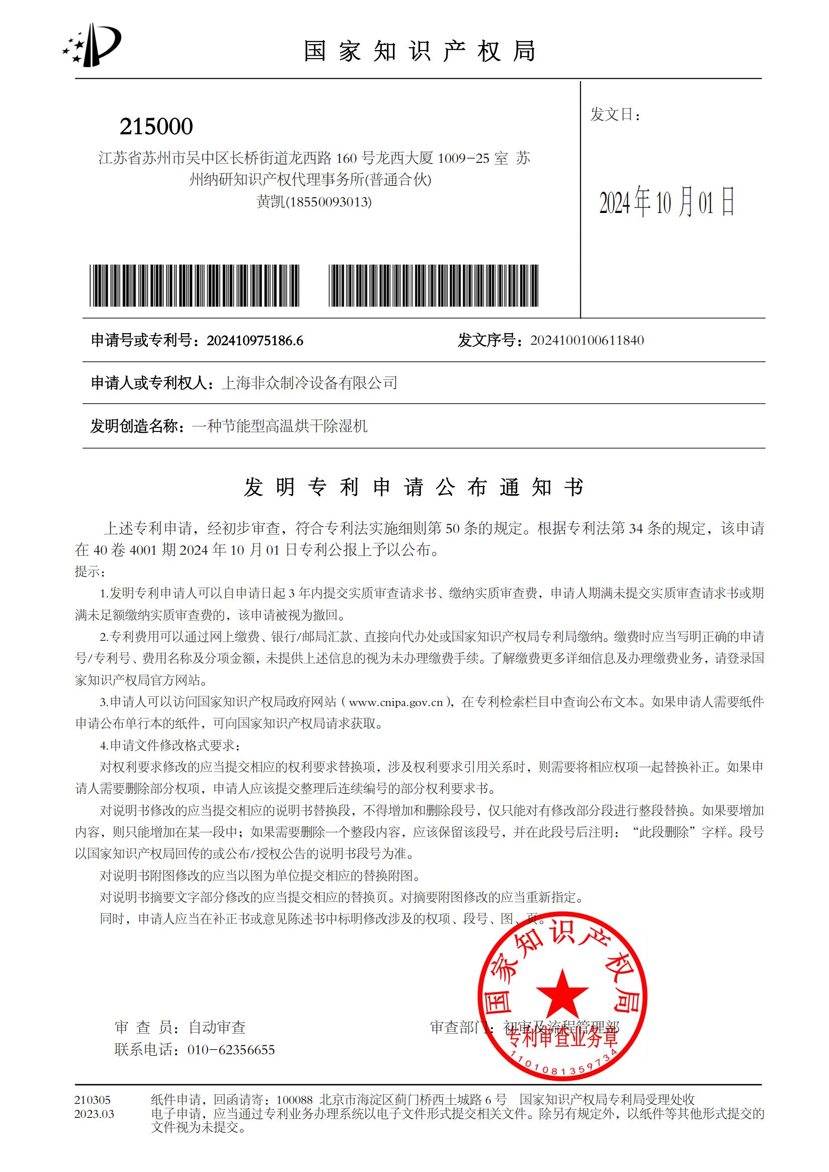 熱烈祝賀上海非眾制冷“一體式的屋頂空調機,專利號:ZL 2024 2 0258431.7”實用新型專利獲得國家知識產權局授權,取得專利證書并申請公布發明專利 一種節能型高溫烘干除濕機,申請號或專利號:202410975186.6