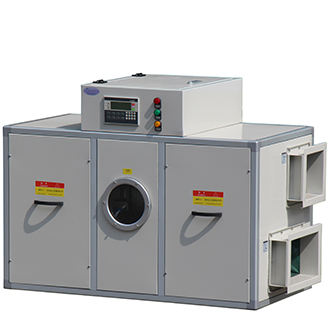 再生空氣(一般取自室外或機房)加熱到達到100-130℃后,反向吹入再生區。硅膠中已吸附的水份被脫附成水蒸氣,隨著再生空氣被風機排走,從而完成了水分的從系統內到系統外的轉移。轉輪再生后恢復了吸濕能力,轉入除濕扇區重新除濕。